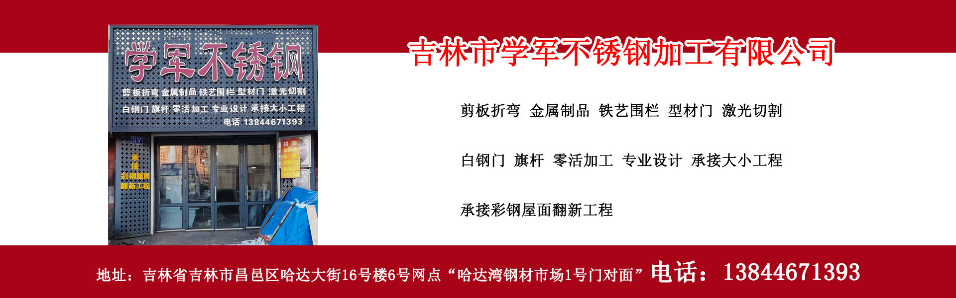 吉林市學(xué)軍不銹鋼加工有限公司專(zhuān)業(yè)從事吉林市不銹鋼加工制作、吉林市白鋼門(mén)制作、吉林市白鋼隔斷制作、吉林市剪板折彎、激光切割、型材門(mén)、電子感應(yīng)門(mén)、旗桿制作、彩鋼屋面翻新、吉林市鐵藝圍欄加工制作等吉林市不銹鋼加工制作、吉林市金屬加工制作服務(wù)單位,位于吉林省吉林市。